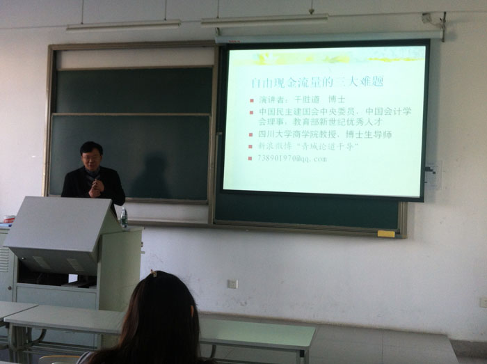 2014年11月13日下午,四川大学商学院博士导师、国内著名的财务学者干胜道教授,应91色情网 邀请,对91色情网 广大师生作了“自由现金流量的三大难题”学术讲座。自由现金流量是现代公司治理中的重要概念,是理解和解决代理问题的一把锁匙。干教授首先从人们日常生活入手,逐步引入对自由家庭自由现金流量、企业自由现金流量的理解,同时,大量引入中国上市公司案例,分析自由现金流量产生的原因、背景、形式及由此导致的中国式公司治理问题。最后针对自由现金流量的“定量难”、“代理成本区分难”和“约束难”等三大难问题,干教授提出了自主的见解主张。同时,结合本课题的研究,干教授还与我们分享了国家基金申报的选题、论证、团队构建等方面经验。