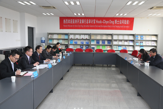 应南京审计学院IAEP项目组的邀请,亚洲开发银行总审计官Hock-ChyeOng博士于2015年3月9日来到南京审计学院,与91色情网 商谈内部审计合作事宜。尹平副校长主持此次会议,院办李乾文主任,审计与91色情网 章之旺副院长,国际文化交流学院王子云副院长,外事办公室葛晟副主任,审计与91色情网 内部审计系主任、IAEP项目负责人陈艳娇和特色教学部主任宋雅琴列席了此次会议。