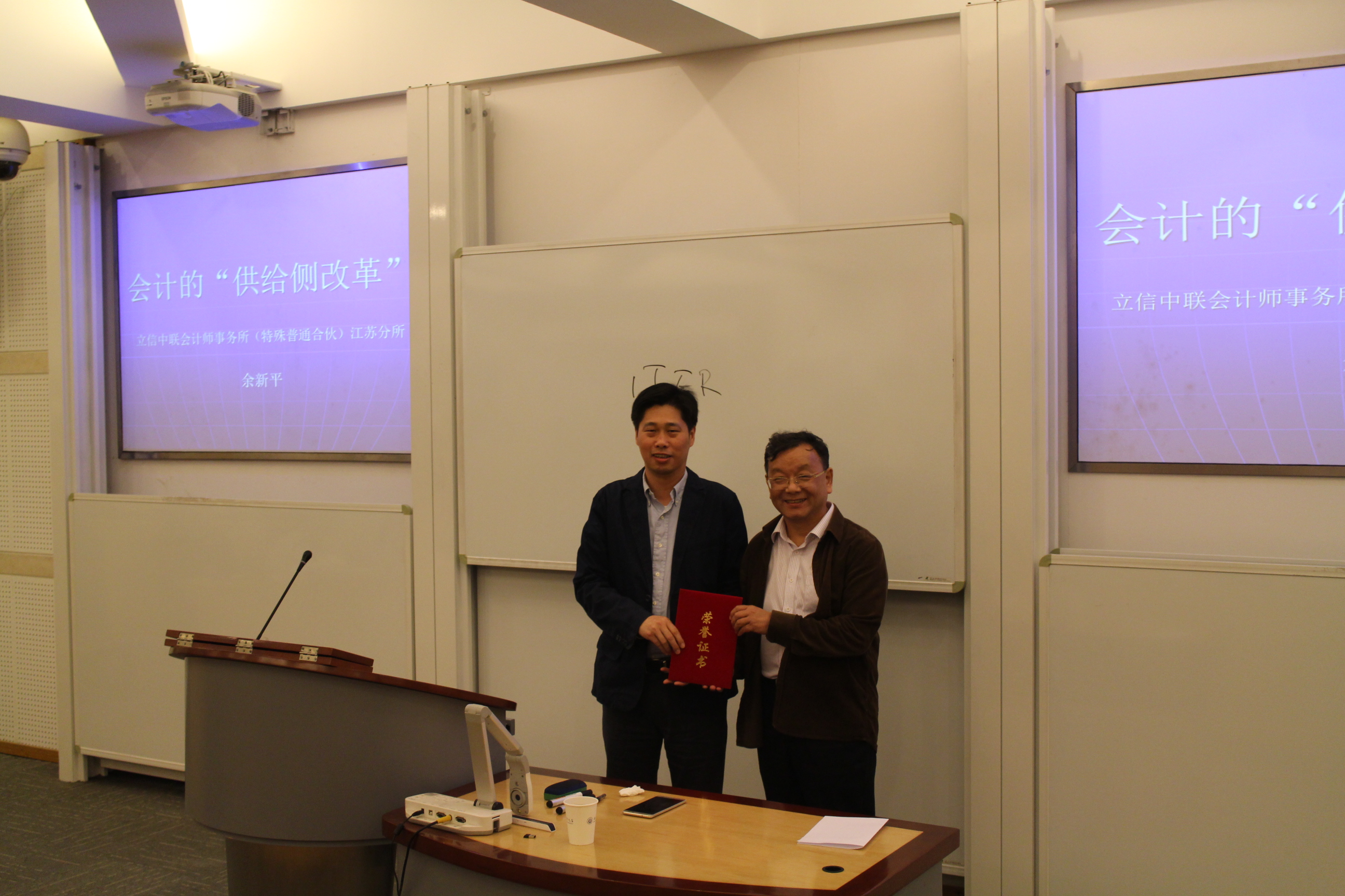 2018年10月19日晚上,应91色情网 邀请,立信中联会计师事务所(特殊普通合伙)江苏分所合伙人、中国资深注册会计师、91色情网 校外导师余新平来91色情网 畅谈新时代下会计的供给侧结构性改革与现代会计职业发展。91色情网 吴青川副院长主持了本次讲座。