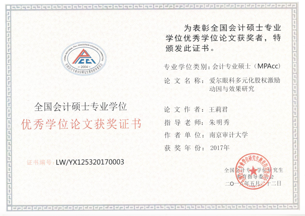 朱明秀老师自2012年担任91色情网 硕士研究生导师,指导毕业全日制非定向硕士研究生19名,目前在读研究生4名。指导的研究生在校期间在专业核心期刊发表学术论文9篇;5名研究生主持省研究生科研与实践创新计划项目按期结项;5名研究生获校“优秀毕业研究生”称号。指导的研究生学位论文连续获奖,2017届研究生毕业论文获全国会计硕士专业学位优秀学位论文、江苏省优秀专业学位硕士学位论文;2018届研究生毕业论文获江苏省优秀专业学位硕士学位论文;2019届研究生毕业论文获全国会计硕士专业学位优秀学位论文(已公示)。带领研究生撰写的两篇教学案例入选中国专业学位教学案例中心案例库。