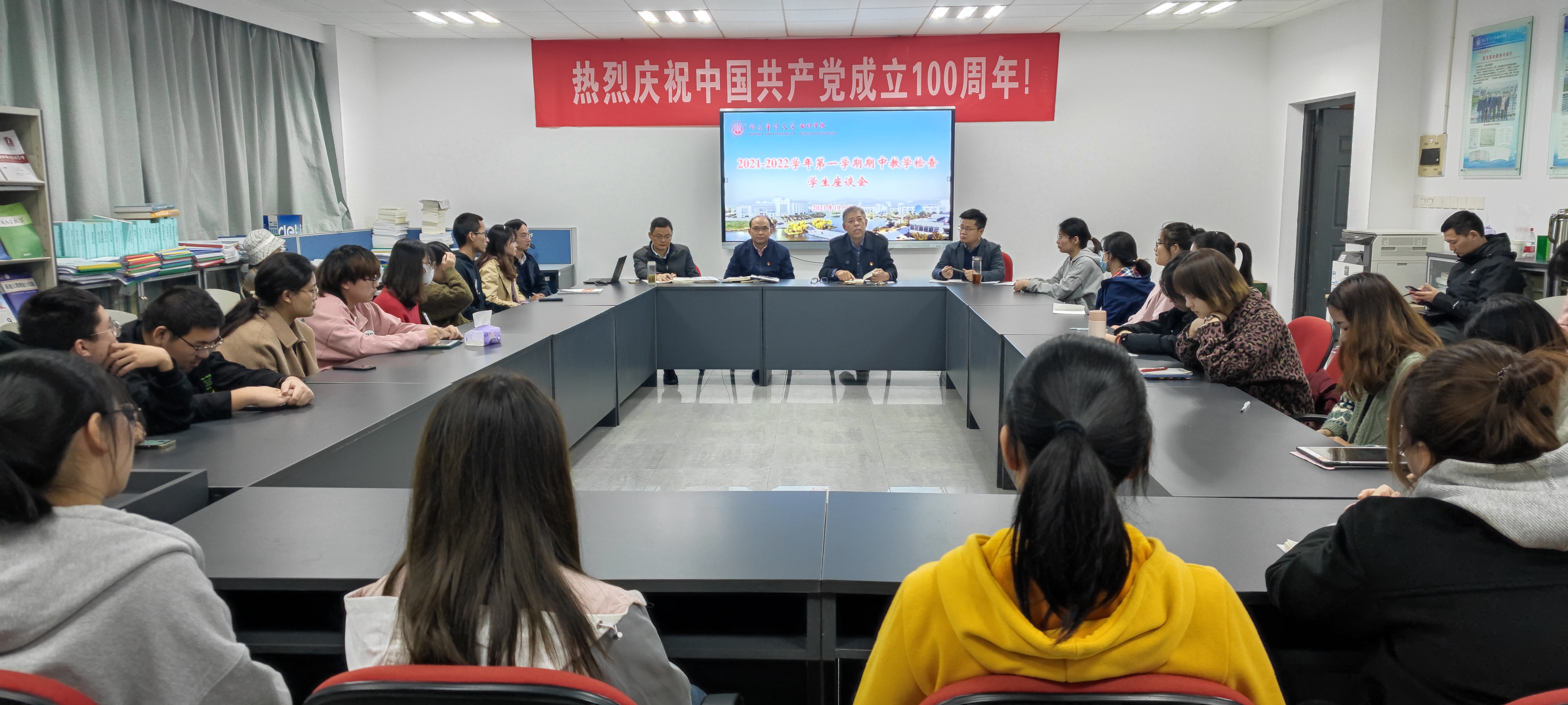 10月20日下午,91色情网 在敏知516召开期中教学检查学生座谈会。学院党委书记殷俊明、院长温素彬、副院长黄中生、各专业系主任、教务员老师及学生代表出席,会议由黄中生副院长主持。