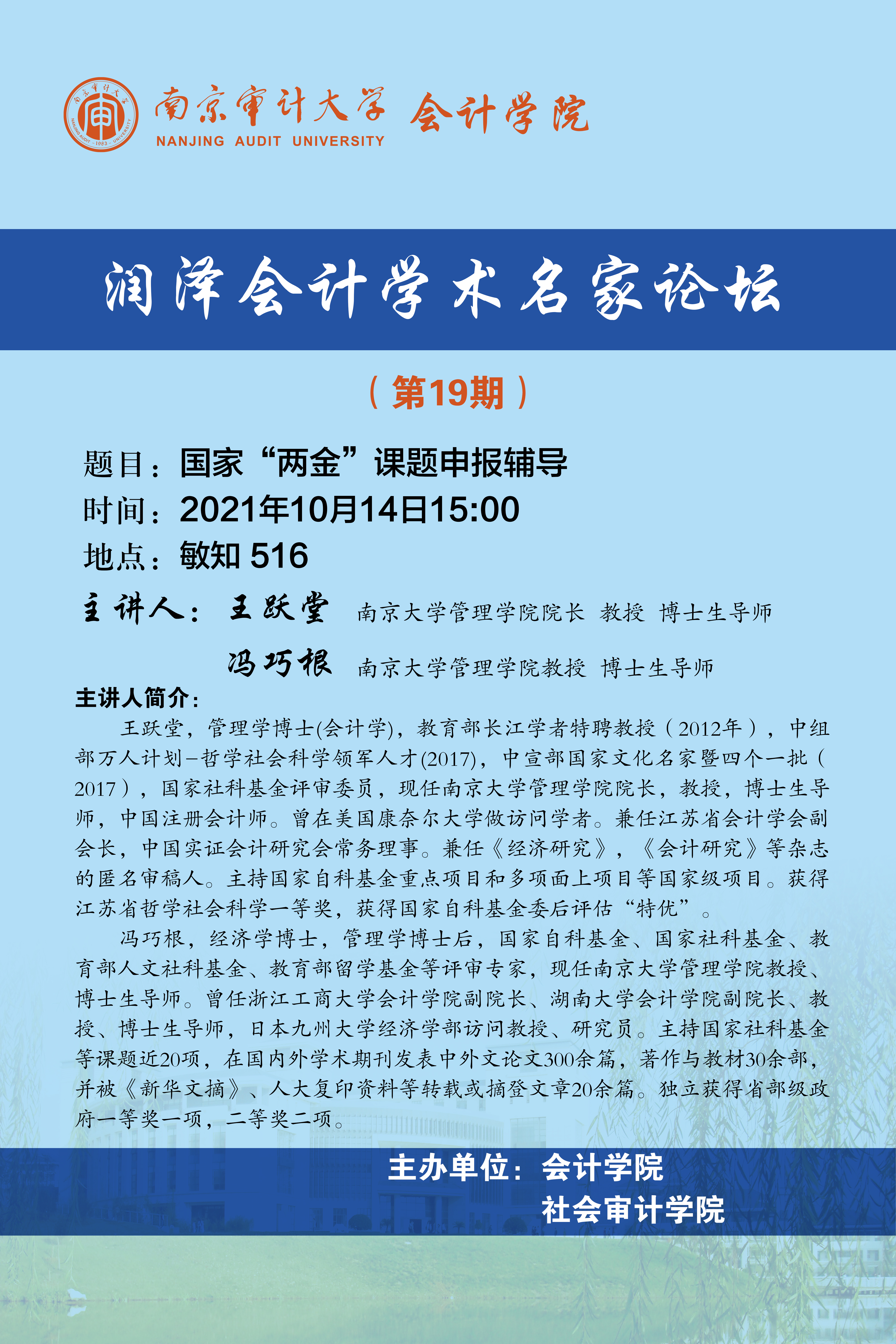 润泽会计学术名家论坛第19期:王跃堂、冯巧根-国家“两金”课题申报辅导