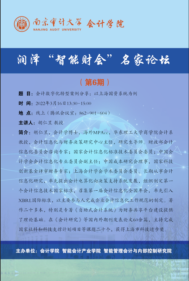 润泽“智能财会”名家论坛第6期:胡仁昱-会计数字化转型案例分享:以上海国资系统为例