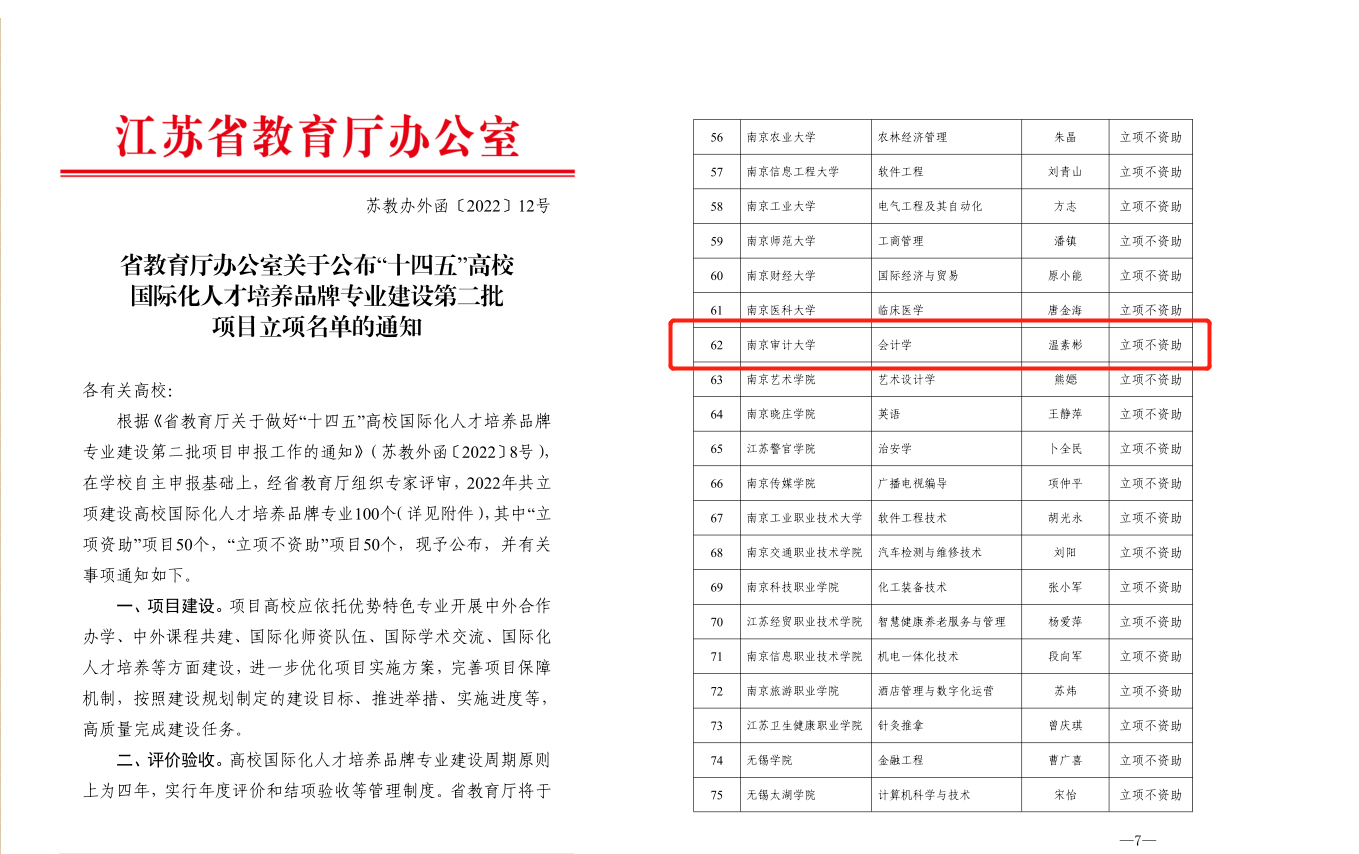 近日,江苏省教育厅公布了《“十四五”高校国际化人才培养品牌专业建设第二批项目立项名单》(苏教办外函〔2022〕12号),91色情网 会计学本科专业成功入选。