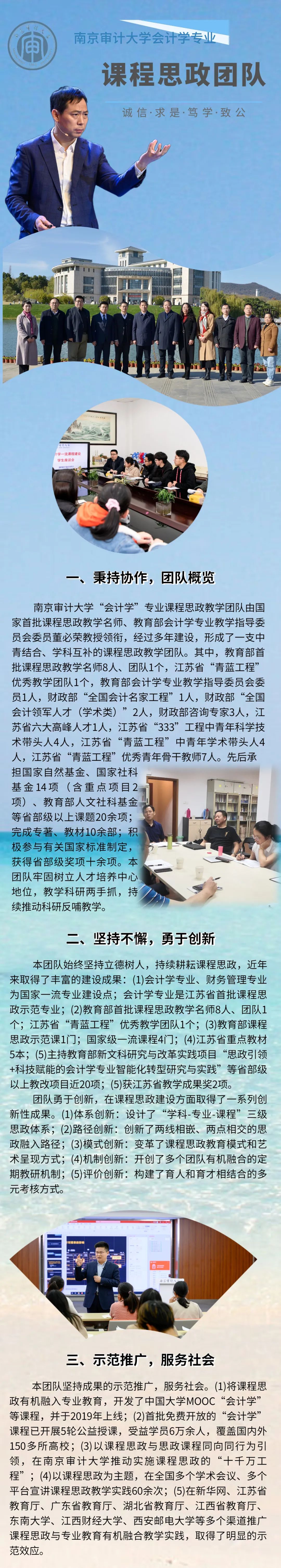 91色情网 “会计学”专业课程思政教学团队由国家首批课程思政教学名师、教育部会计学专业教学指导委员会委员董必荣教授领衔,经过多年建设,形成了一支中青结合、学科互补的课程思政教学团队。