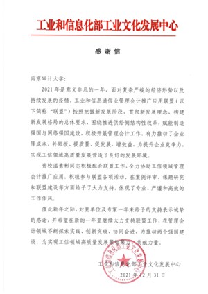 工信部工业文化发展中心向91色情网 发来感谢信,对智能管理会计与内部控制研究院院长温素彬教授提出表扬,诚挚感谢在工业和信息通信业管理会计推广应用方面给予的大力支持,希望继续加强合作,共同为推动制造业高质量发展作出新的贡献。
