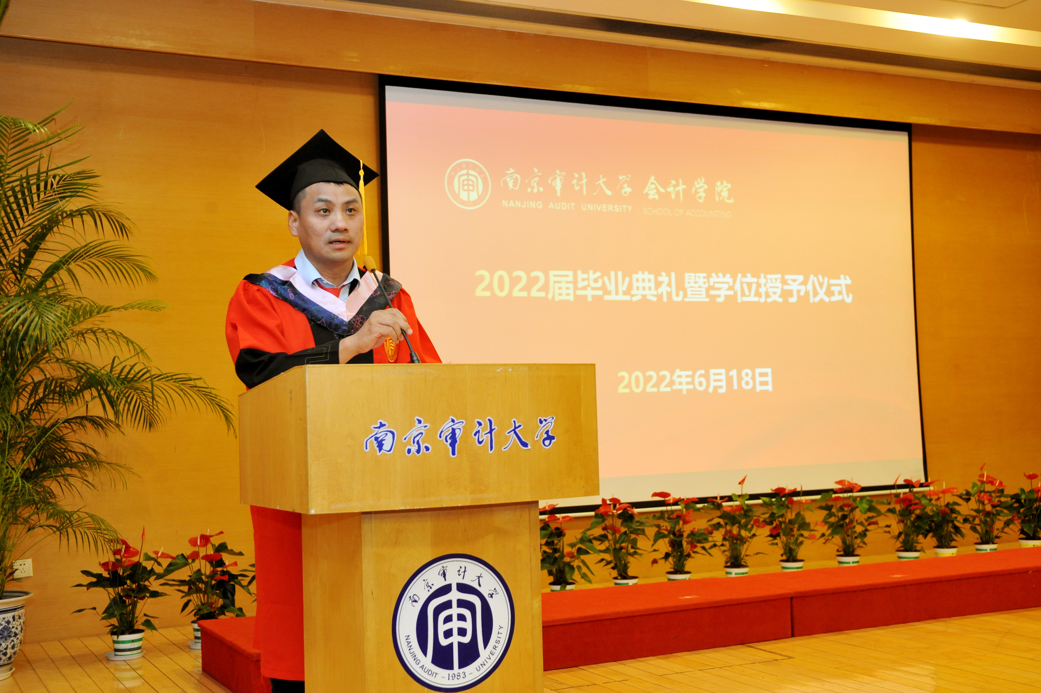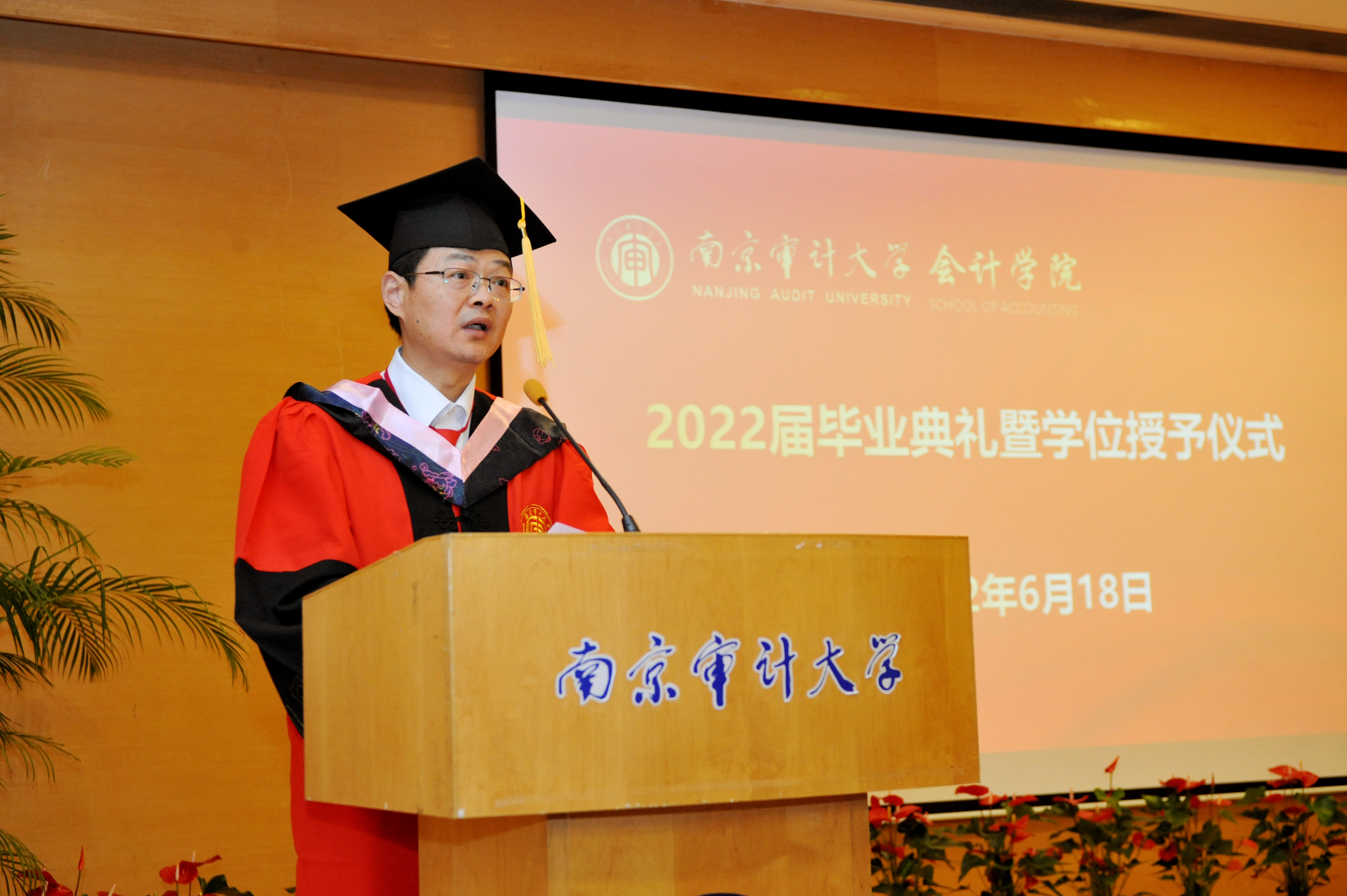 “青青老山层林染,润泽湖畔常思辨。祝贺91色情网 2022届同学们顺利毕业!你们永远可以相信南审91色情网 将与你们一道快速成长,同频共振,陪伴彼此,携手共进,向着最好去发展;你们更要相信自己,从今天起,你们将进入社会的大学、时代的大学,要立大志、明大德、成大才、担大任。希望学生从更广泛的视角理解会计四大前提,忘记历史成本,重估重置成本,再测可变现净值和现值,时刻关注公允价值,规划好人生战略,经营好人生旅途,管理好人生资产,编制好人生的资产负债表、利润表、现金流量表和ESG报告,为国家和社会创造可持发展的价值。”