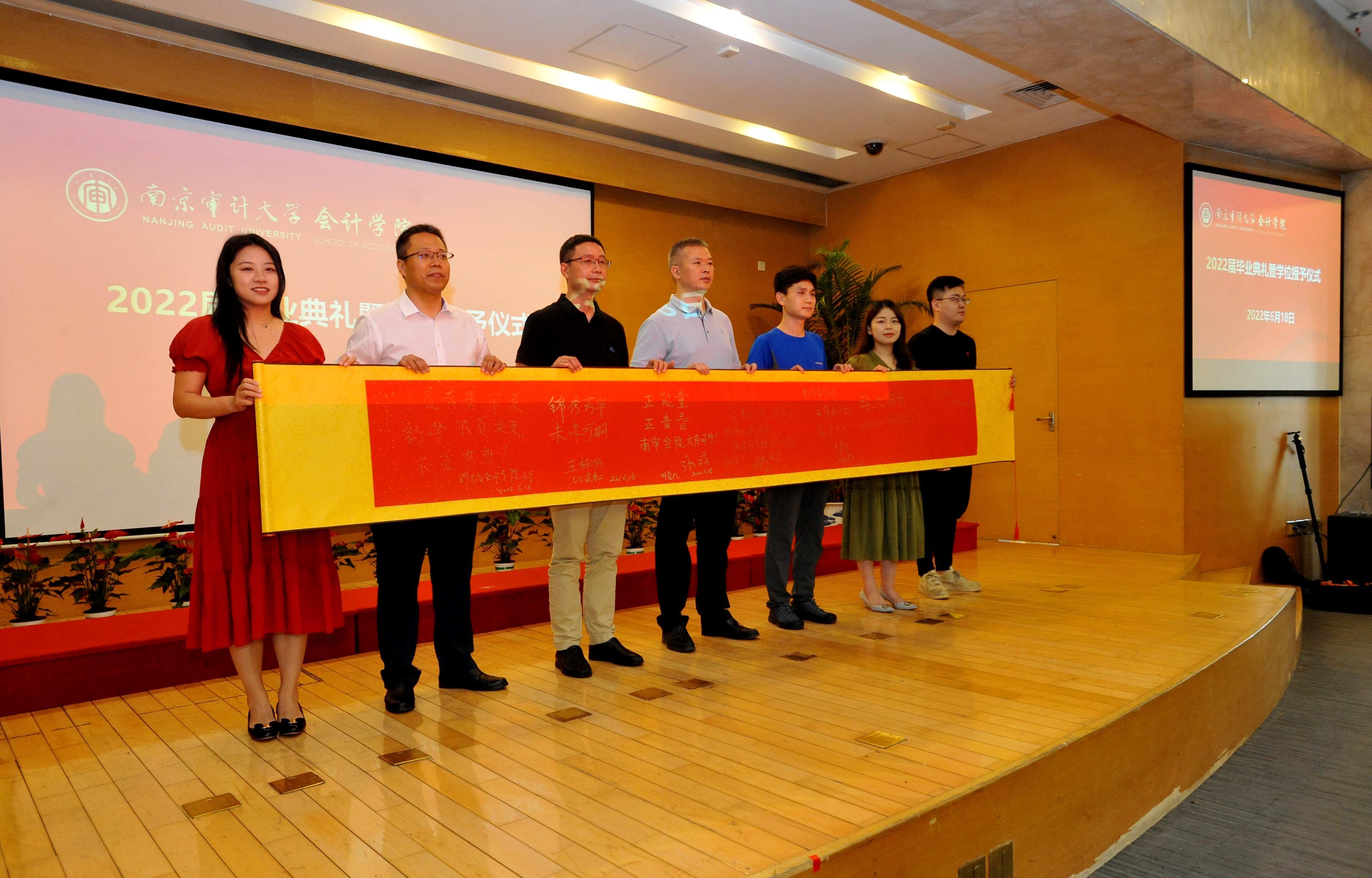本次毕业典礼,特别邀请了1989级会计校友、天衡会计师事务所高级合伙人、江苏天健华辰资产评估有限公司董事长陈小兵,1996级会计校友,江苏泰治科技股份有限公司财务总监郝敬国,2000级会计校友、南京熊猫电子股份有限公司党委委员、董事会秘书和公司秘书王栋栋,2001级会计校友中信银行南京分行营业部主任张磊,2009级会计学(中澳班)校友、江苏云化能源科技有限公司副总经理汪逢亚,2011级财务管理校友、南京华泽微福科技发展有限公司总经理李芳冰,2013级财务管理校友,江苏尽孝道养老集团总经理张延等七位优秀校友同台见证了2022届毕业典礼,并共同为本届毕业生送上诚挚的祝福和美好的祝愿。