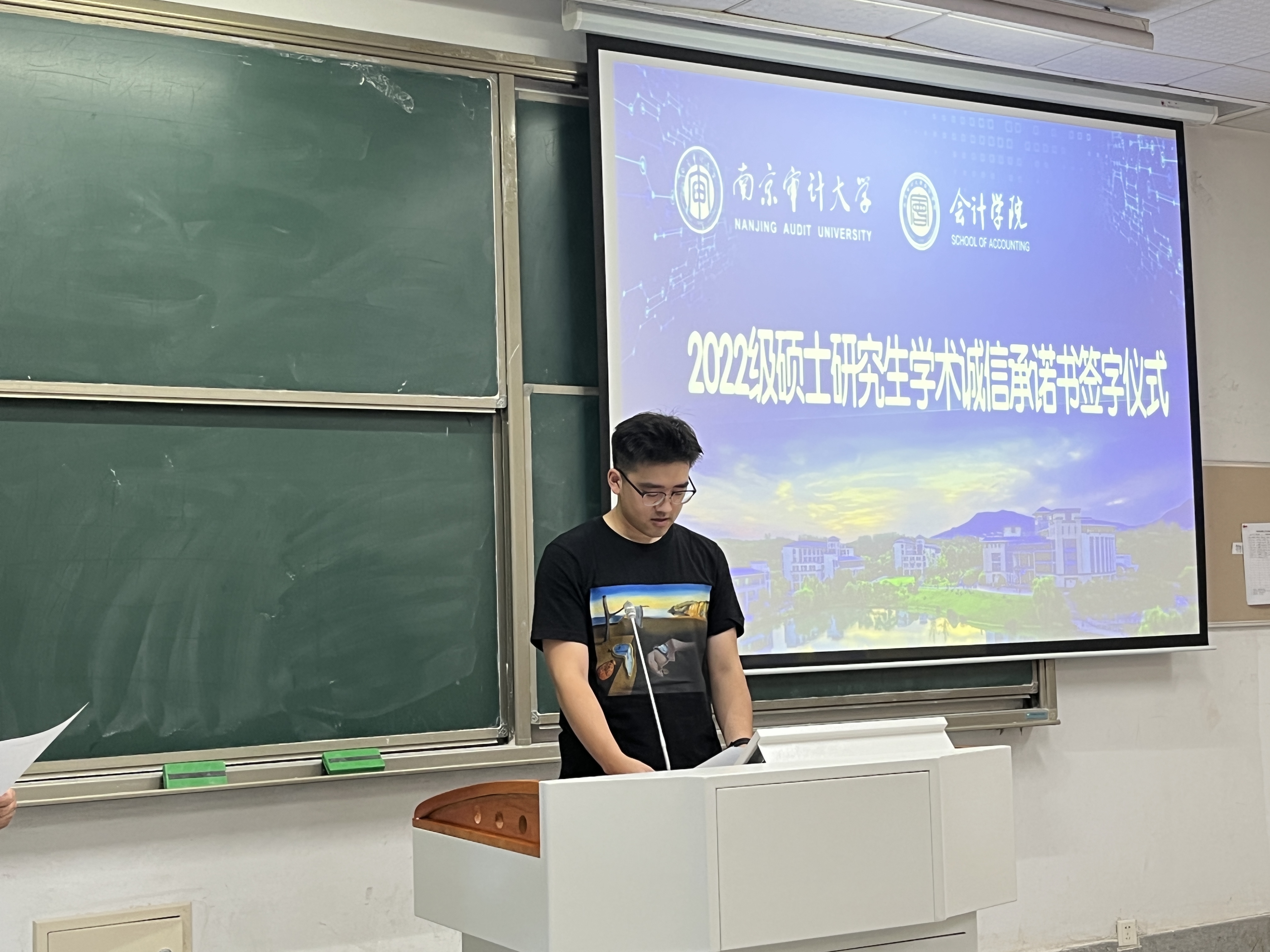 第二项议程举行2022级研究生新生学术诚信承诺书签字仪式,并由新生代表陈意正同学带领全体同学宣誓,以弘扬科学精神,规范学术行为。