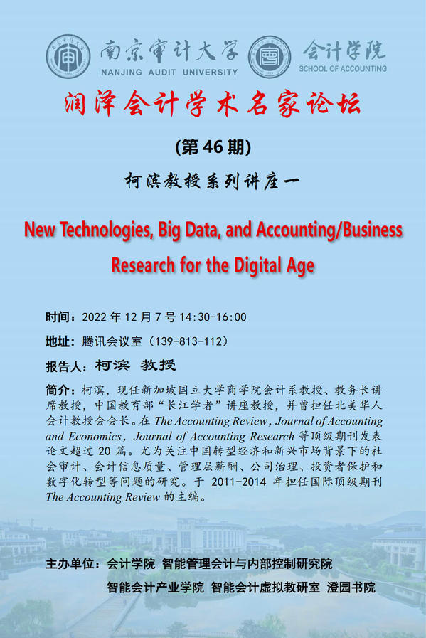 润泽会计学术名家论坛第46期:柯滨——New Technologies, Big Data, and Accounting/Business Research for the Digital Age