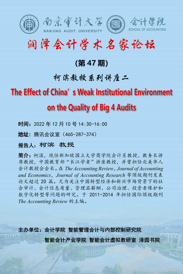 润泽会计学术名家论坛第47期:柯滨——The Effect of China’s Weak Institutional Environment on the Quality of Big 4 Audits