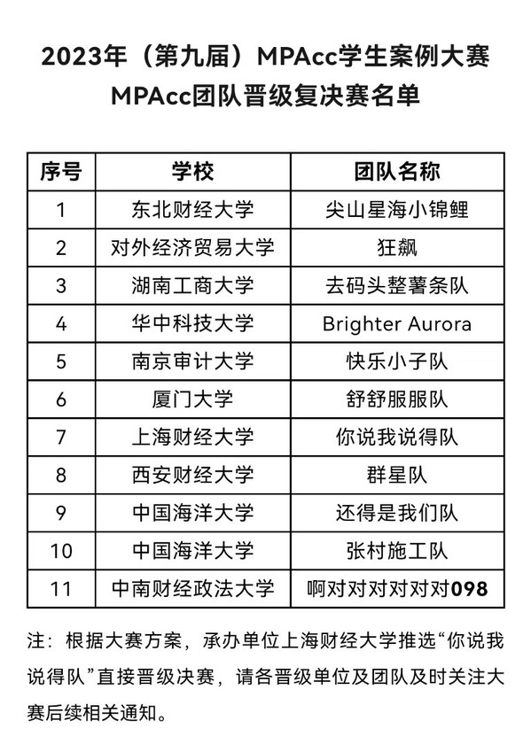 本次2023年(第九届)MPAcc学生案例大赛复决赛将于617日于上海财经大学举办。通过复决赛将决出特等奖、一等奖、二等奖、三等奖、单项奖。