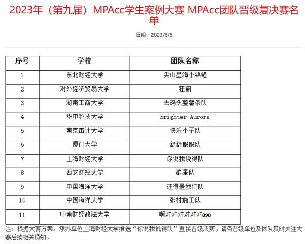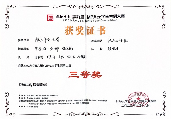 618日,2023年全国第九届MPAcc学生案例大赛在上海财经大学成功举办。由崔秀梅、赵娜和温素彬三位老师指导、2022级会计专硕研究生顾明捷、肖祎宁、龙思玥、马欣、汪仁文、李冠男组成的“快乐小子队”凭借优异表现,经过初赛第一阶段、第二阶段,冲进全国前3‰,经过复赛、决赛,荣获全国三等奖,献礼校庆四十华载。