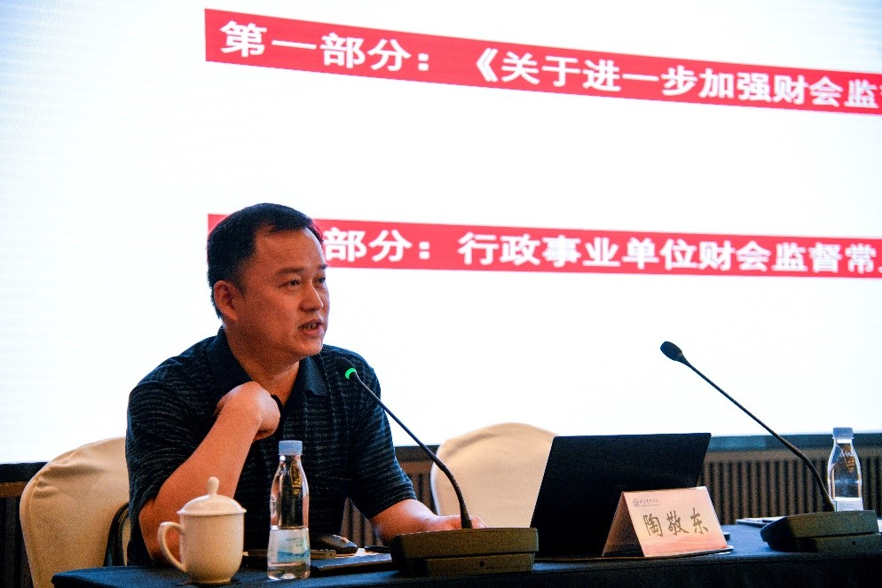 江苏省财政厅财政监督局局长陶敬东作“加强财会监督,严肃财经纪律”的主题报告,他首先介绍了《关于进一步加强财会监督工作的意见》的出台背景、重要意义,对财会监督的内涵、定位、要求和目标进行解读,强调应健全财会监督体系、完善财会监督贯通机制、对重点领域加强监督力度,而后分析了行政事业单位财会监督常见问题,对如何具体开展行政事业单位的财会监督工作提出了建议。