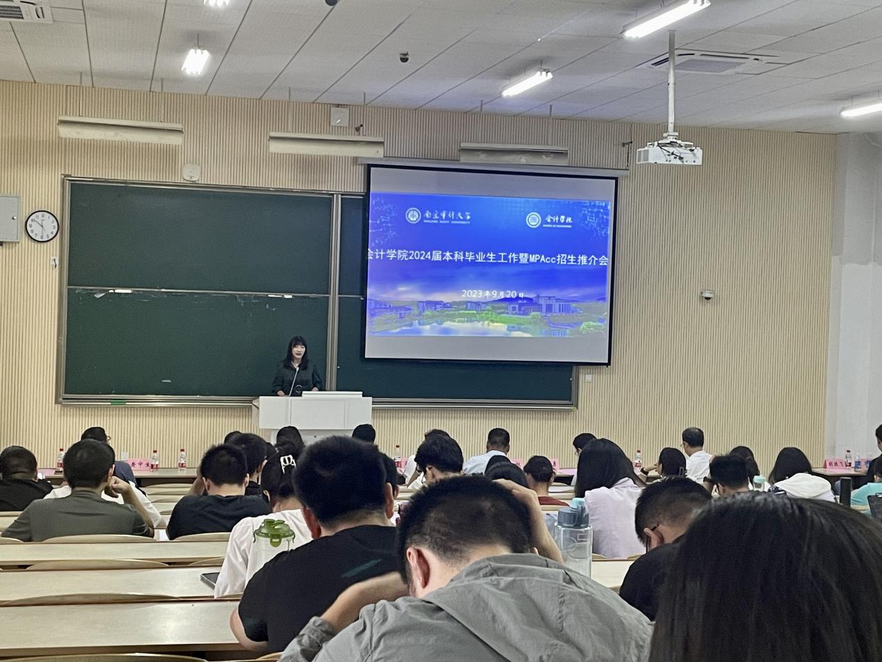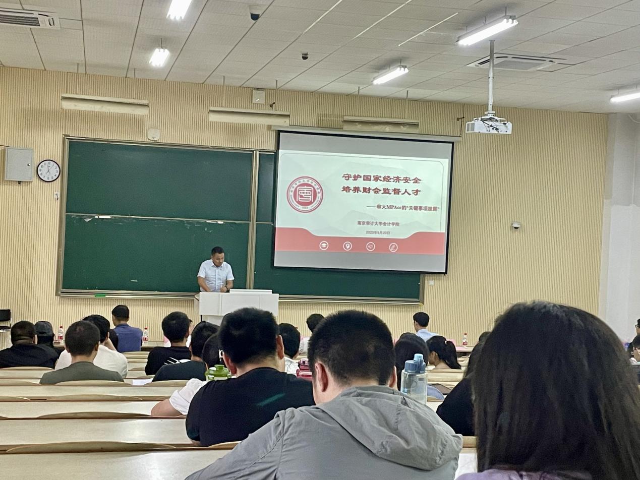 最后,潘俊作“守护国家经济安全培养财会监督人才——审大MPAcc的‘关键事项披露’”的报告,从培养模式、师资力量、研究方向等方面详细介绍了MPAcc项目,引导同学们培养学术兴趣,增强学术素养。潘俊指出该项目中的四大研究方向——资本市场会计与财务、注册会计师审计与财会监督、政府会计与国家治理、大数据分析与智能管理会计,都是如今财会行业的研究热点,督促学生紧跟行业发展趋势,明确未来发展方向,提前做好规划并逐步落实行动。