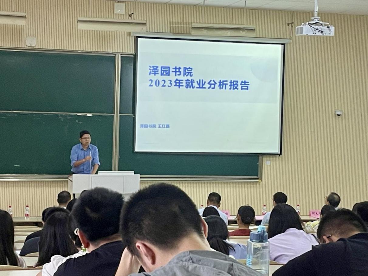 王红磊以泽园书院2023届就业数据为基础,为毕业生介绍考研、留学、就业等毕业去向。他指出毕业生应该以自身价值观、性格、能力和兴趣为核心,分析确定目标、规划路径和落实行动,找到毕业去向的最优解。