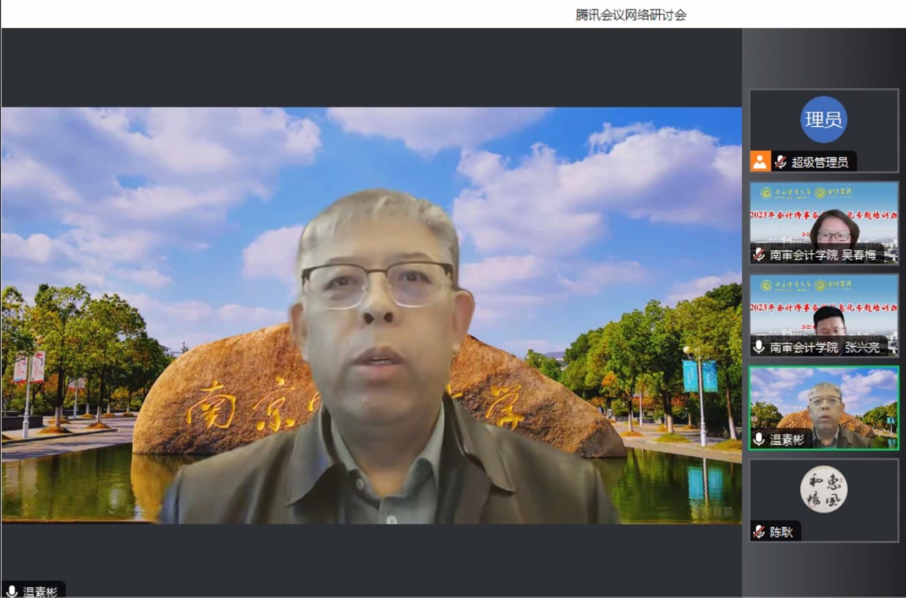 11月18日上午的课程“会计信息化发展与智能财务实践”由91色情网 陈耿教授主讲。他对宏观环境的数字经济与微观环境的数字化、智能化进行了深度解读与分析,引用国务院发布的《“十四五”数字经济发展规划》等文件,表明数字经济是继农业经济、工业经济之后的主要经济形态,数据作为一种新型生产要素,已经成为五大要素的重要组成部分。因此,数字经济是会计审计的大机遇,提出抓住机遇的新视角与新思维是计算思维和数据素养,并结合现实情景详细讲解了其内涵、价值、关键以及培养路径,并对学员提出的疑问进行耐心的解答。
