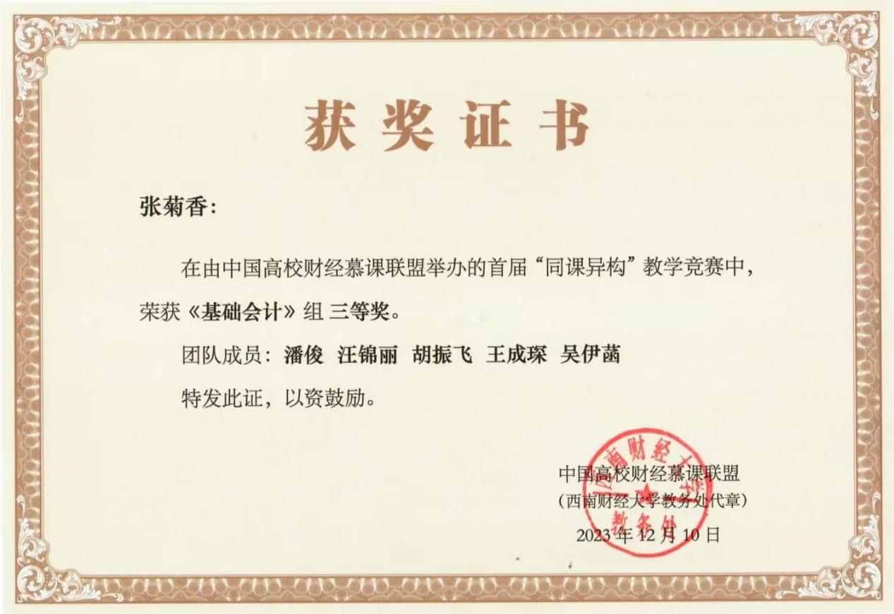 2023年10月21日至22日,首届中国高校财经慕课联盟《基础会计》“同课异构”课程思政教学竞赛在东北财经大学成功举办。来自中央财经大学、上海财经大学、中南财经政法大学等全国33所知名财经院校的“基础会计”课程骨干教师展开了激烈的角逐,91色情网 张菊香老师(团队)荣获三等奖。
