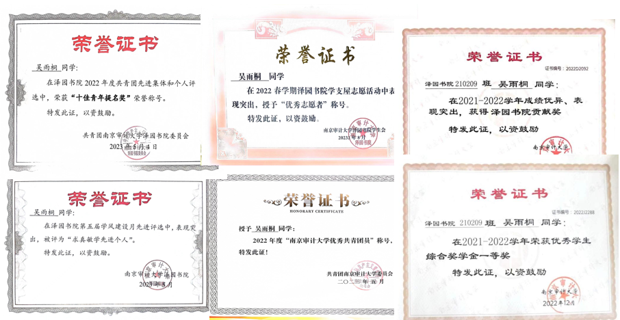 学习方面,学分绩点4.22,专业排名第一,综测等级A+,荣获国家奖学金、校综合一等奖学金、三好学生、先进个人等;志愿服务方面,吴雨桐积极投身于志愿服务,志愿时长超过140小时,连续三年被评为优秀志愿者;实践方面,积极参加国家级项目的调研活动,并在假期开展社会实践活动;竞赛方面,获全国大学生大数据分析技术技能大赛国家一等奖、全国大学生电子商务“创新、创意及创业”挑战赛国家二等奖、全国大学生数学建模竞赛省级二等奖等。