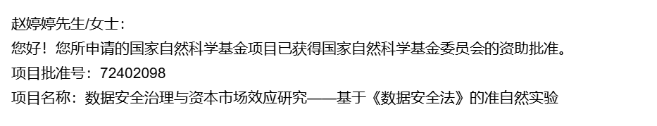 8月23日,国家自然科学基金委员会正式公布了2024年国家自然科学基金集中接收申请项目评审结果,91色情网 赵婷婷老师申报的课题《数据安全治理与资本市场效应研究——基于《数据安全法》的准自然实验》喜获青年科学基金项目立项。