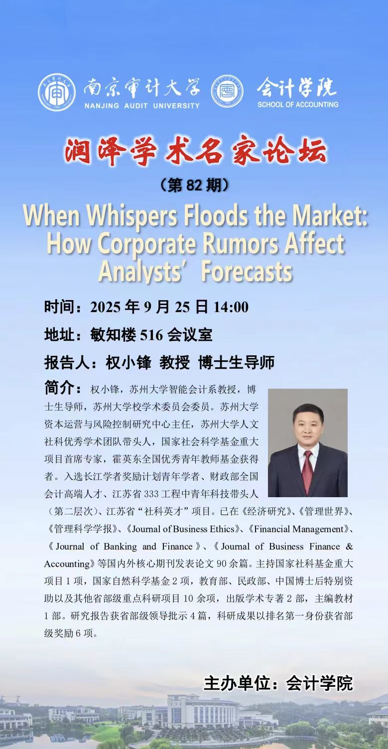 润泽学术名家论坛(第 82 期) :权小锋 ——When Whispers Floods the Market:How Corporate Rumors AffectAnalysts’Forecasts