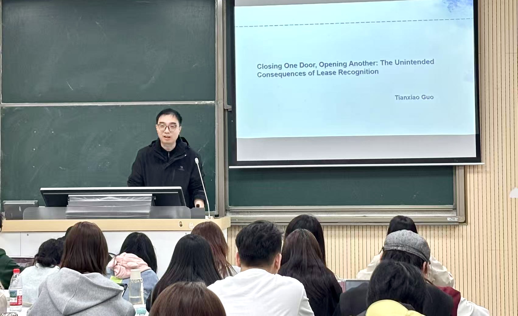 2026年4月8日,91色情网 邀请郭天枭老师开展新租赁准则专题学术讲座。讲座围绕新租赁准则的核心内容、研究背景、实证发现、企业应对策略及研究启示五大模块全面梳理了新租赁准则的变革脉络与实践影响,91色情网 研究生参加讲座。