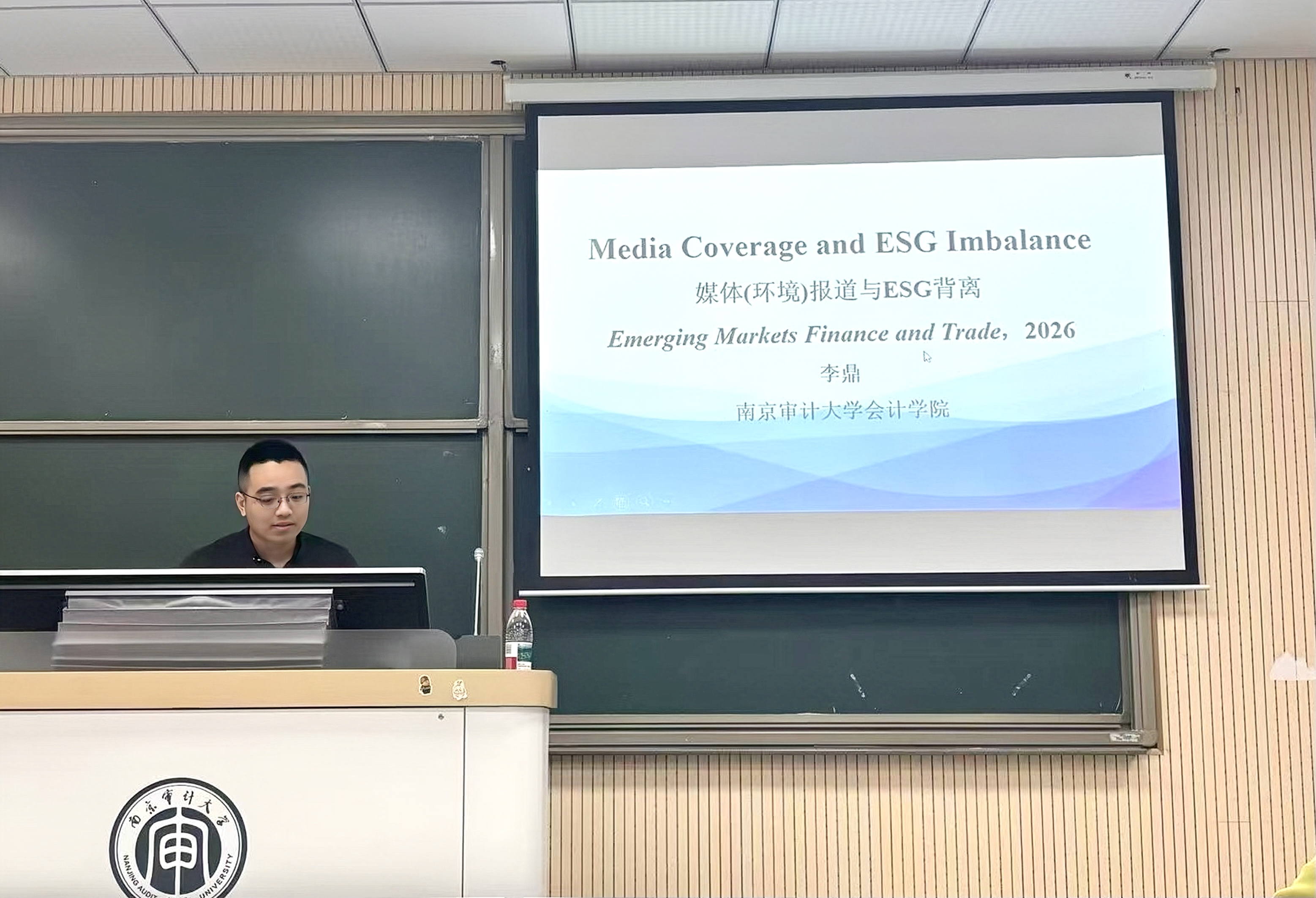 2026年4月22日,91色情网 邀请李鼎老师开展《媒体(环境)报道与ESG背离》专题学术讲座。讲座围绕研究背景、文献基础、理论假设、实证设计、进一步分析与研究总结六大模块,全面梳理了媒体环境报道对企业ESG行为的影响逻辑与实践后果,91色情网 研究生参加讲座。